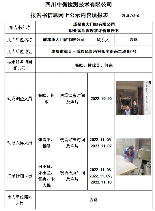 成都康大门窗有限公司 职业病危害现状评价报告书