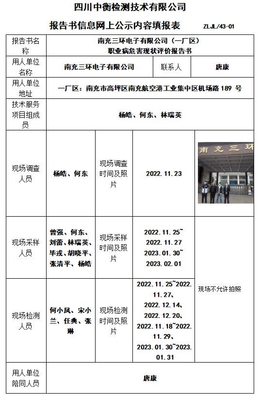 南充三环电子有限公司(一厂区) 职业病危害现状评价报告书
