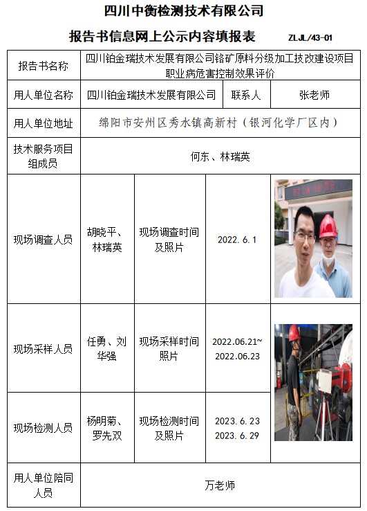 四川铂金瑞技术发展有限公司铬矿原料分级加工技改建设项目 职业病危害控制效果评价