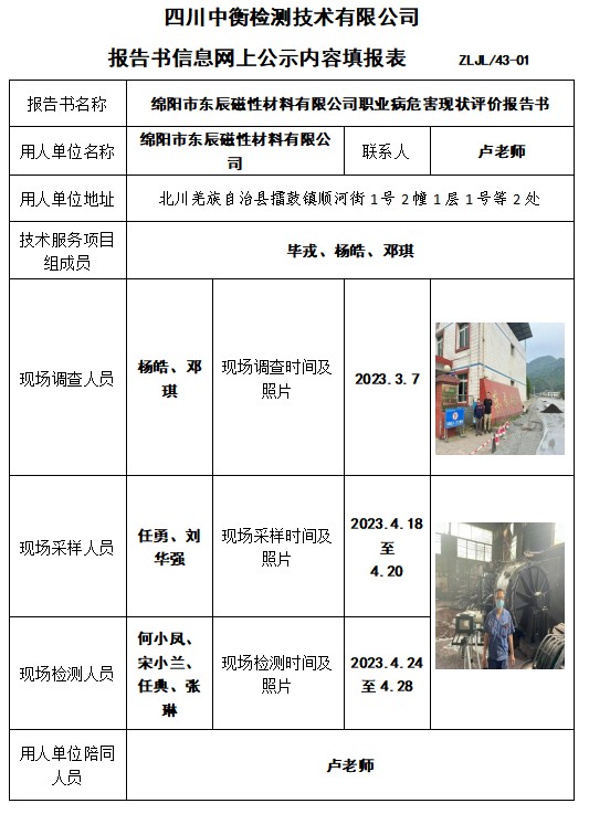 绵阳市东辰磁性材料有限公司职业病危害现状评价报告书