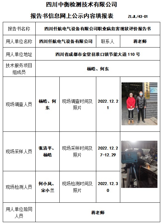 四川仟航电气设备有限公司职业病危害现状评价报告书