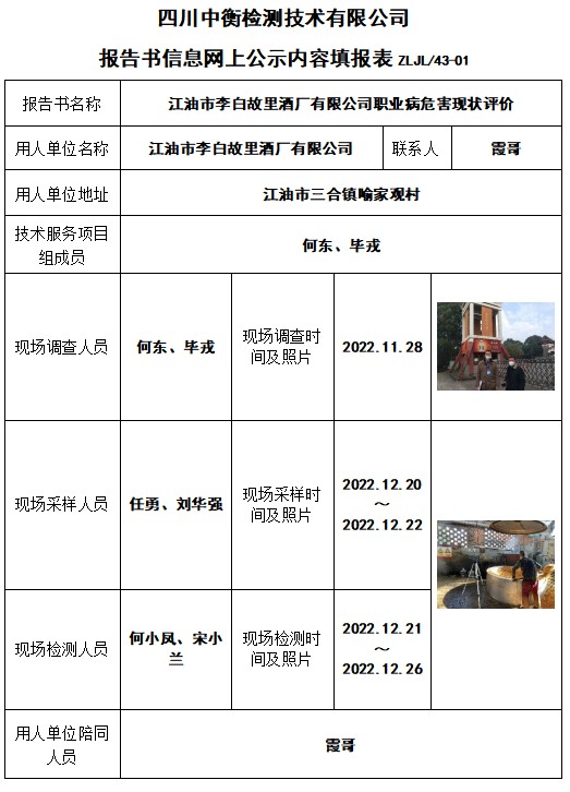 江油市李白故里酒厂有限公司职业病危害现状评价