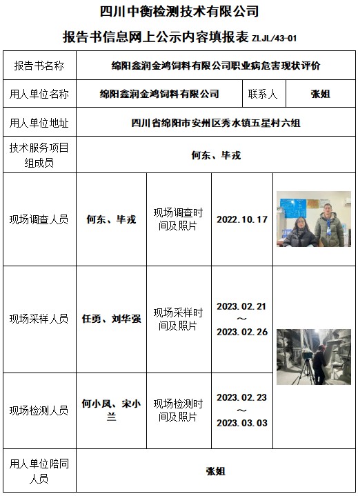 绵阳鑫润金鸿饲料有限公司职业病危害现状评价