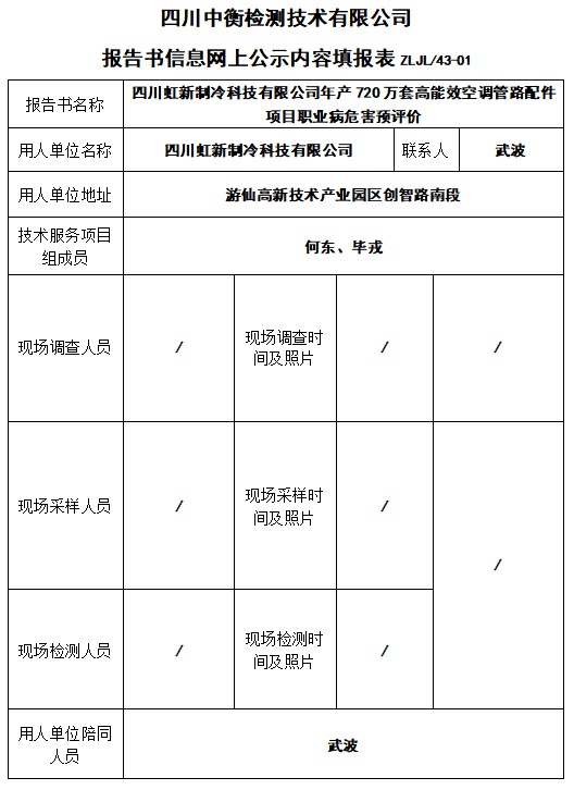 四川虹新制冷科技有限公司年产720万套高能效空调管路配件项目职业病危害预评价