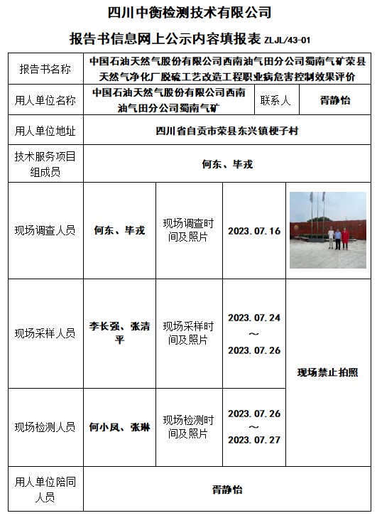 中国石油天然气股份有限公司西南油气田分公司蜀南气矿荣县天然气净化厂脱硫工艺改造工程职业病危害控制效果评价