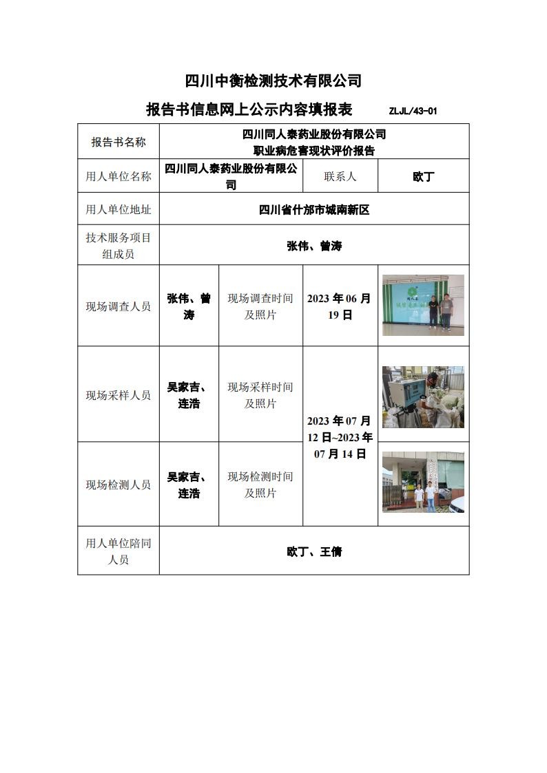 四川同人泰药业股份有限公司职业病危害现状评价