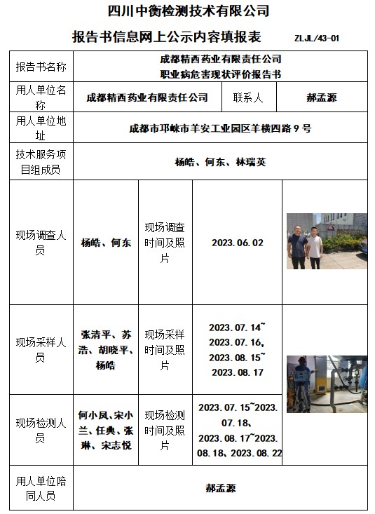 成都精西药业有限责任公司 职业病危害现状评价