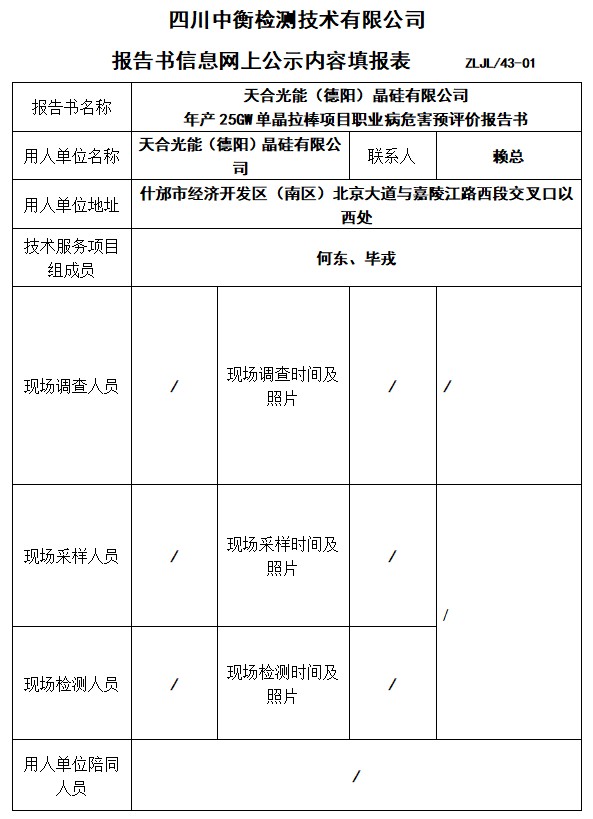 天合光能(德阳)晶硅有限公司 年产25GW单晶拉棒项目职业病危害预评价报告书