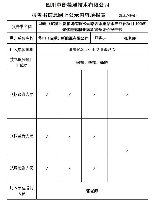 华电(昭觉)新能源有限公司洛古水电站水光互补项目100MW光伏电站职业病危害预评价报告书