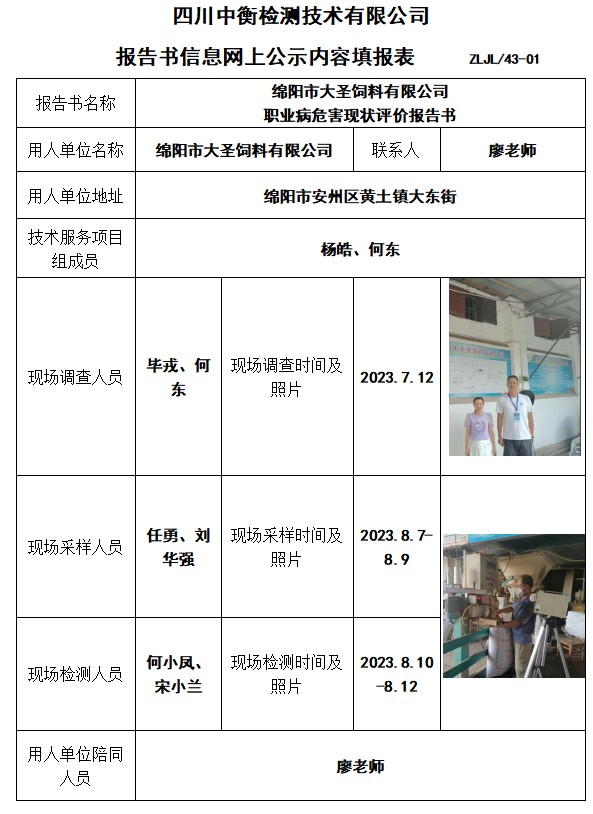 绵阳市大圣饲料有限公司 职业病危害现状评价报告书