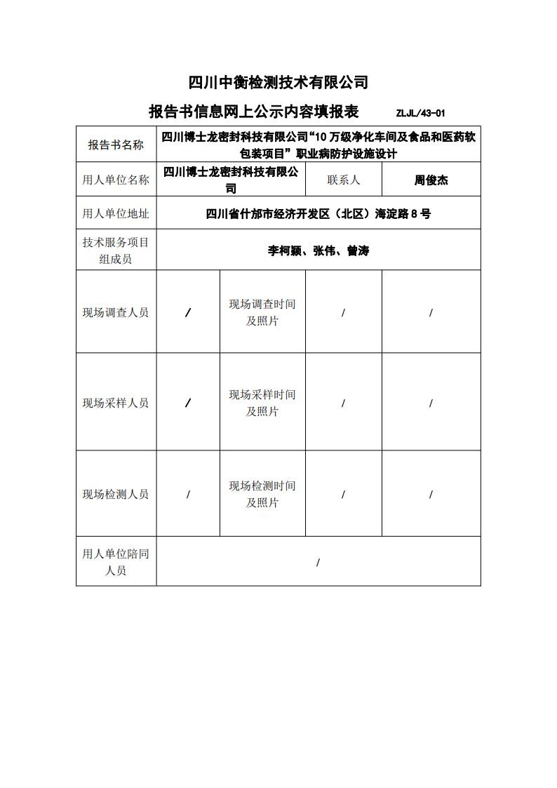 四川博士龙密封科技有限公司“10万级净化车间及食品和医药软包装项目”职业病防护设施设计