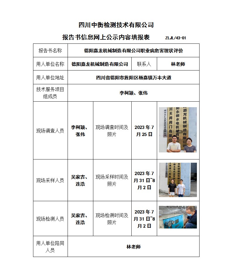 德阳嘉龙机械制造有限公司职业病危害现状评价