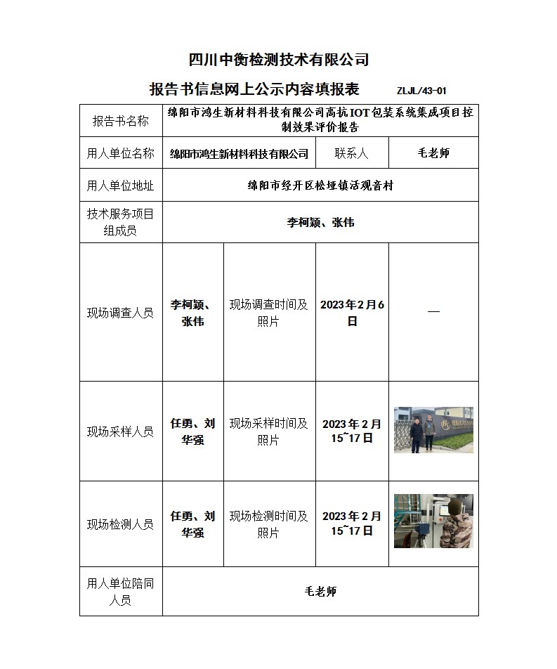 绵阳市鸿生新材料科技有限公司高抗IOT包装系统集成项目控制效果评价报告