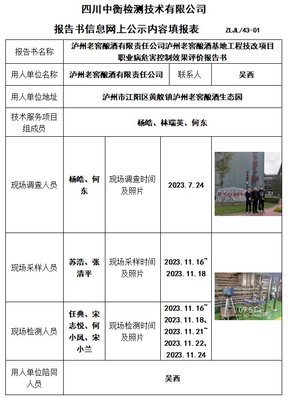 泸州老窖酿酒有限责任公司泸州老窖酿酒基地工程技改项目 职业病危害控制效果评价报告书