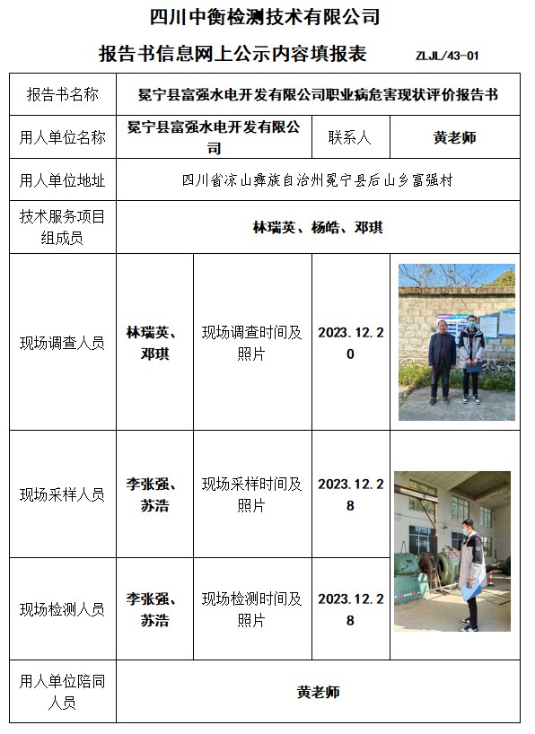 冕宁县富强水电开发有限公司职业病危害现状评价报告书