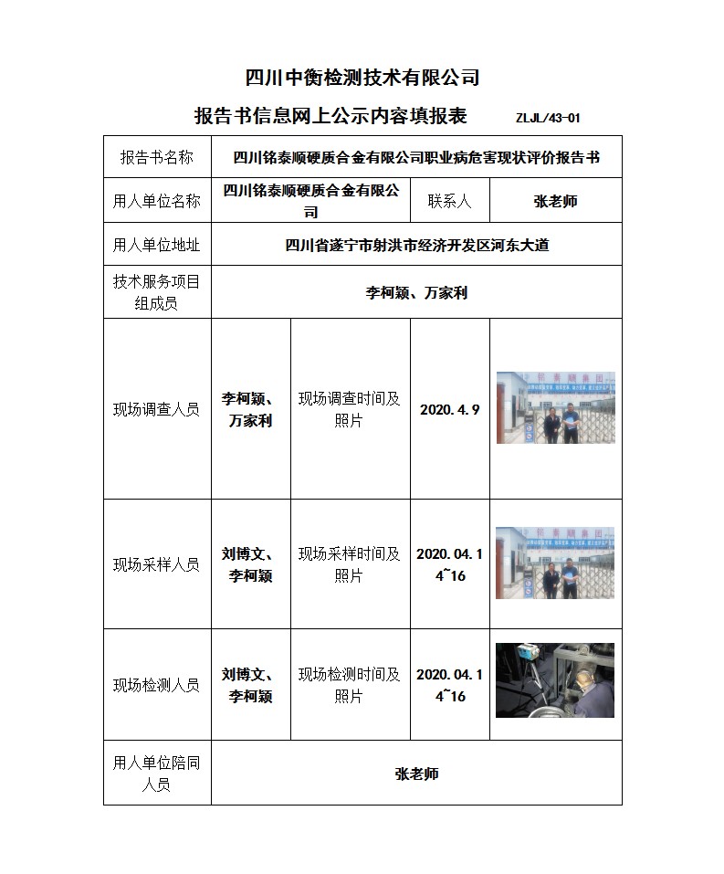四川铭泰顺硬质合金有限公司 职业病危害现状评价报告书