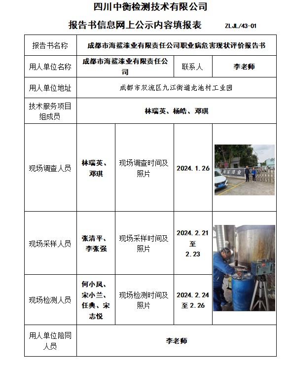成都市海鲨漆业有限责任公司职业病危害现状评价报告书