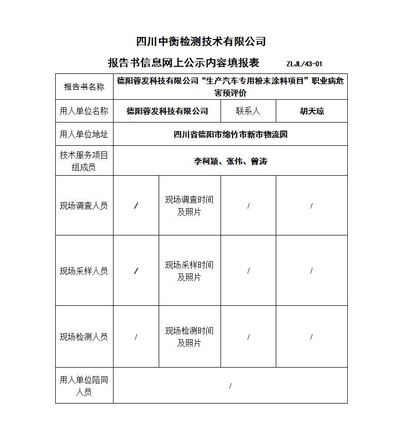 德阳蓉发科技有限公司“生产汽车专用粉末涂料项目”职业病危害预评价