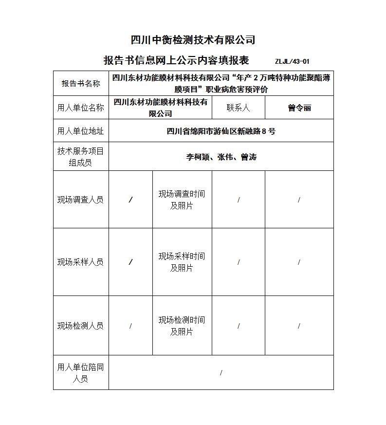 四川东材功能膜材料科技有限公司“年产2万吨特种功能聚酯薄膜项目”职业病危害预评价