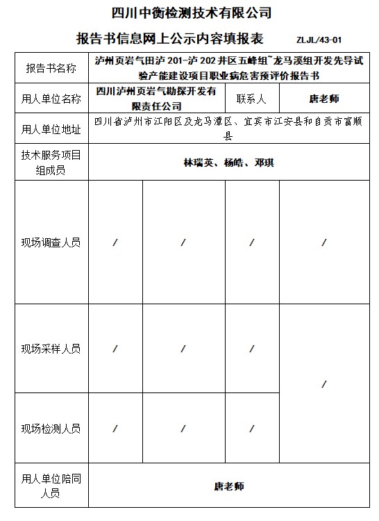 四川泸州页岩气勘探开发有限责任公司 泸州页岩气田泸201-泸202井区五峰组~龙马溪组开发先导试验产能建设项目职业病危害预评价报告书