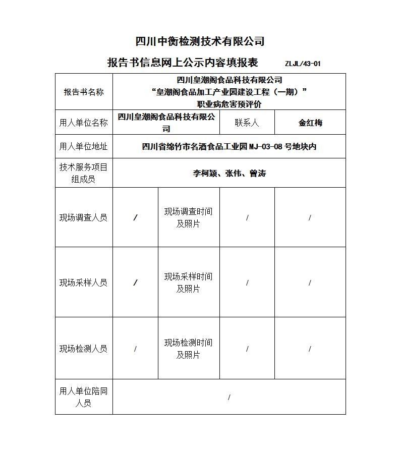四川皇潮阁食品科技有限公司“皇潮阁食品加工产业园建设工程(一期)”职业病危害预评价