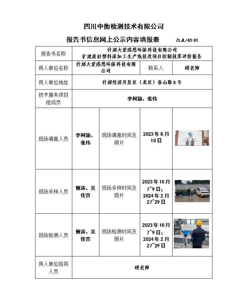 什邡大爱感恩环保科技有限公司 扩建废旧塑料深加工生产线技改项目 职业病危害控制效果评价报告书