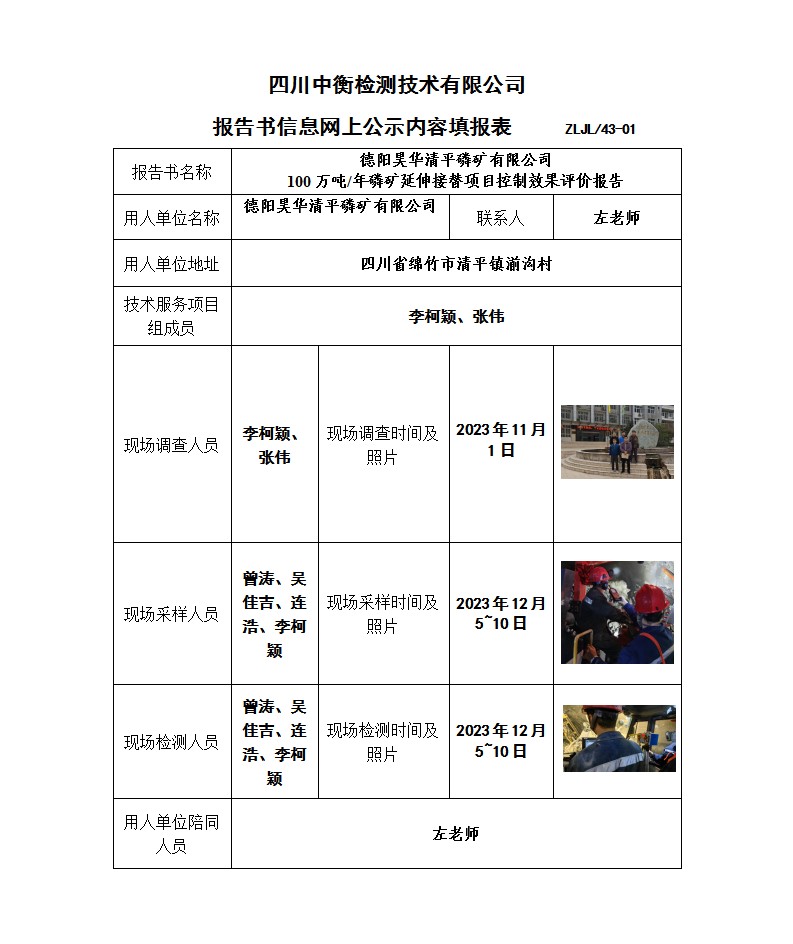 德阳昊华清平磷矿有限公司 100万吨/年磷矿延伸接替项目 职业病危害控制效果评价报告书
