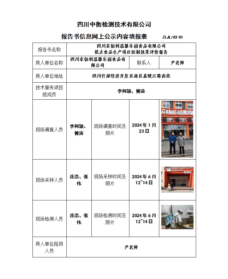 四川家佰利温馨乐园食品有限公司 糕点食品生产项目 职业病危害控制效果评价报告书