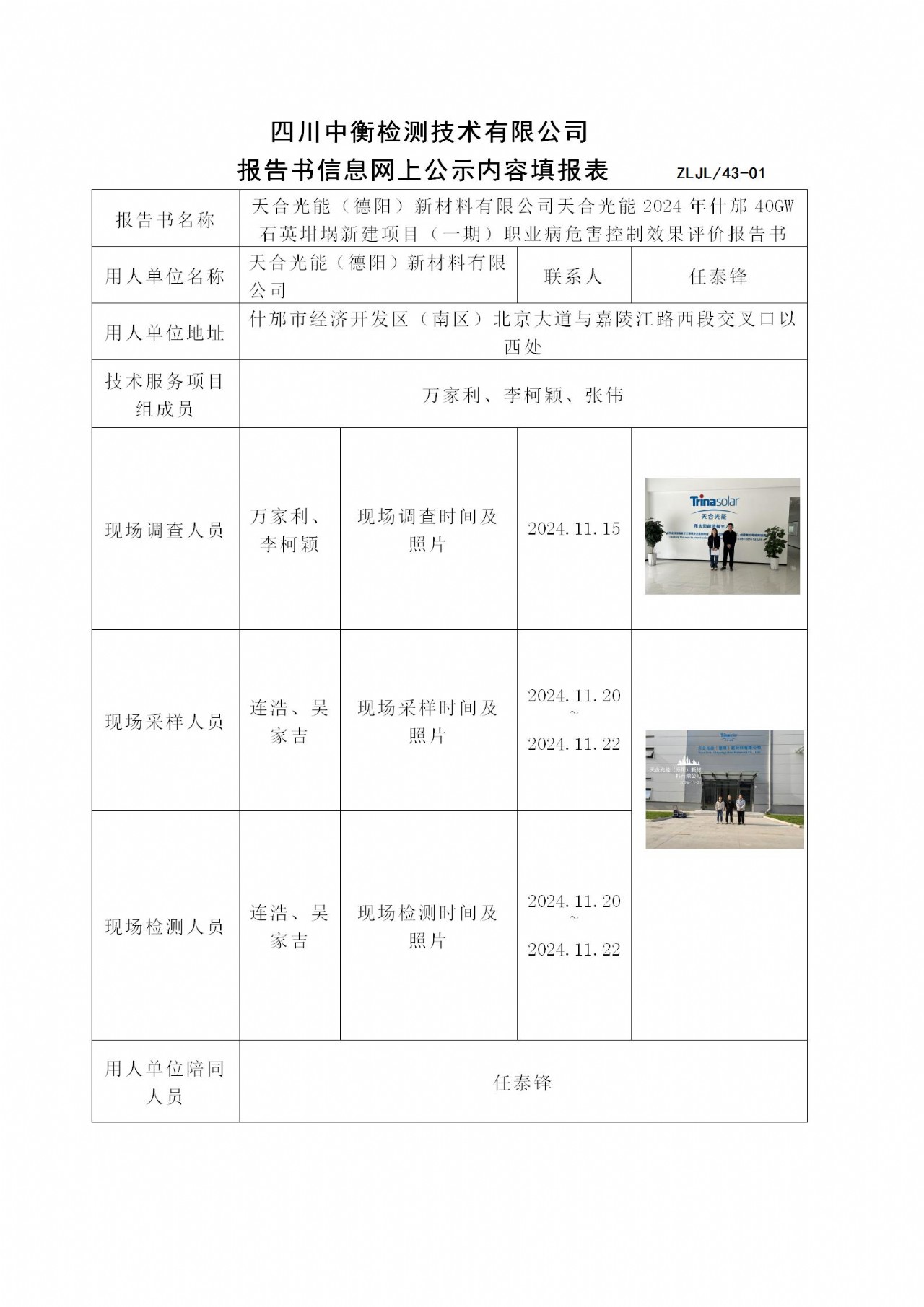 天合光能(德阳)新材料有限公司天合光能2024年什邡40GW石英坩埚新建项目(一期)职业病危害控制效果评价