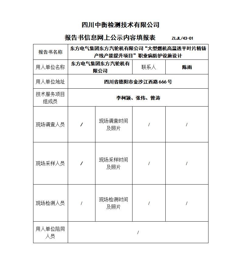 东方电气集团东方汽轮机有限公司“大型燃机高温透平叶片精铸产线产能提升项目”职业病防护设施设计专篇