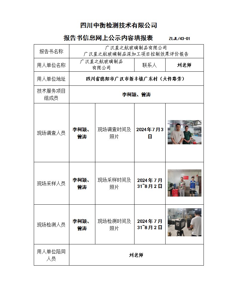 广汉星之航玻璃制品有限公司 广汉星之航玻璃制品深加工项目 职业病危害控制效果评价