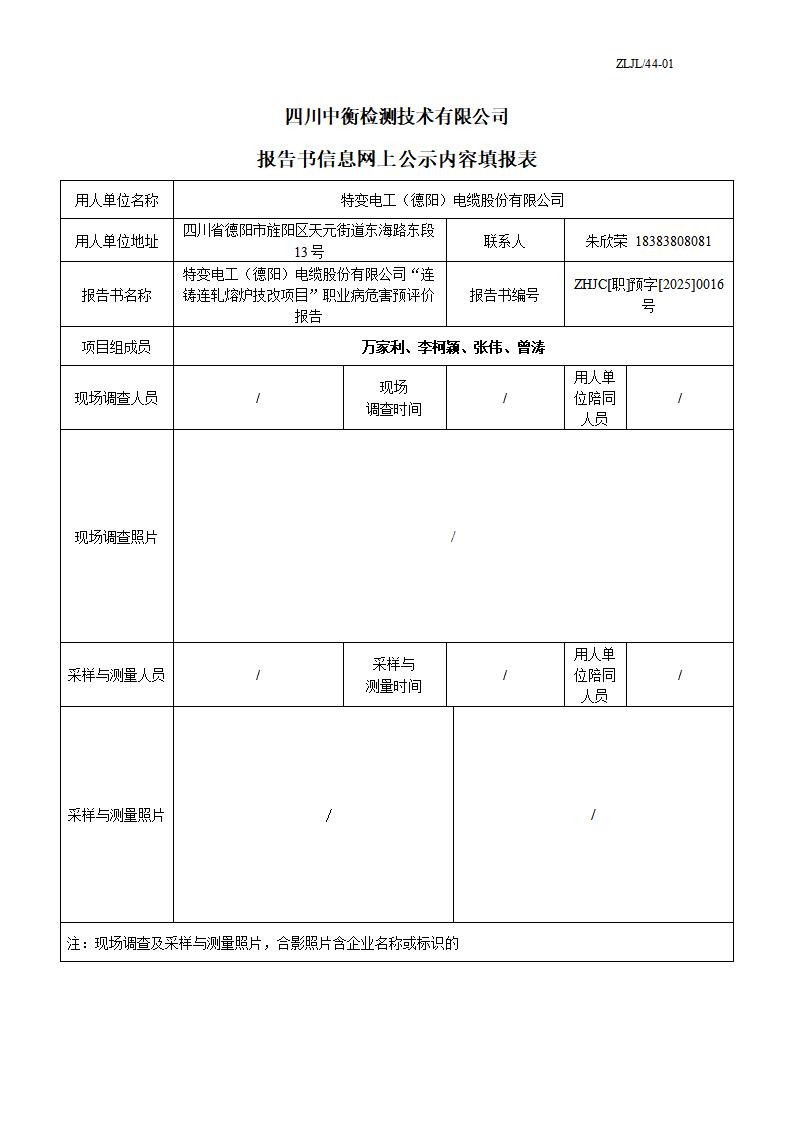 特变电工(德阳)电缆股份有限公司“连铸连轧熔炉技改项目”职业病危害预评价