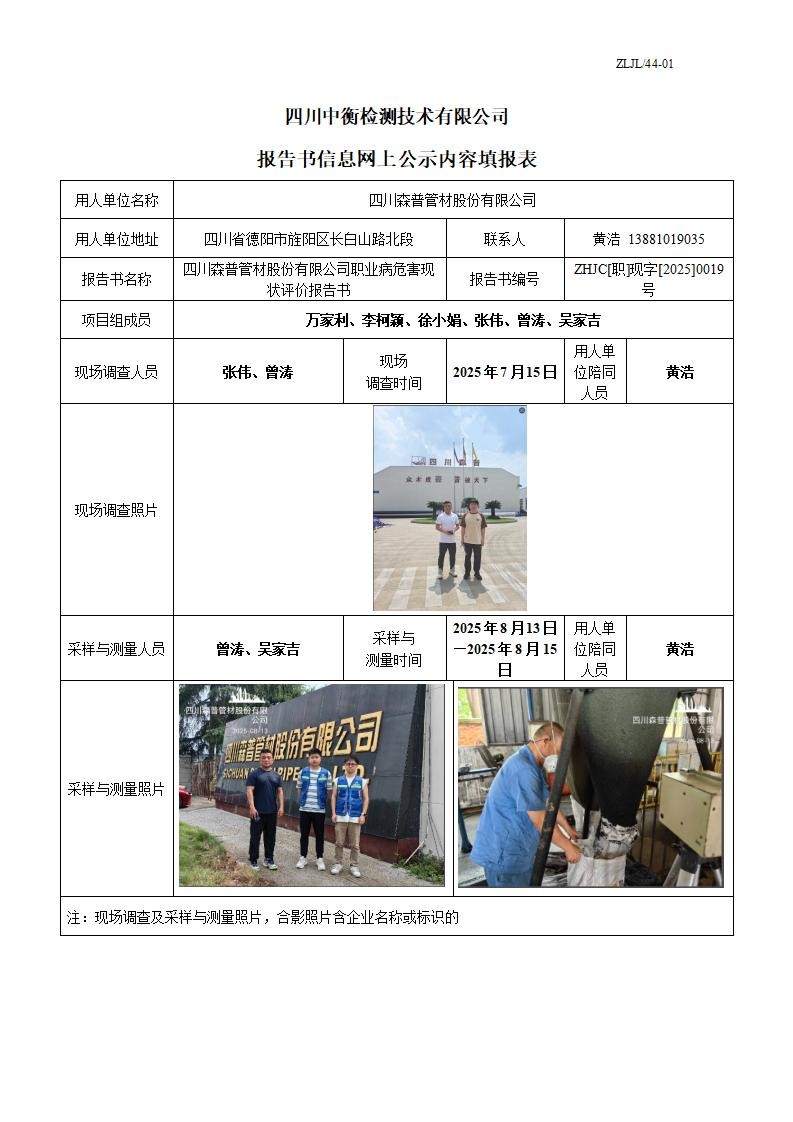 四川森普管材股份有限公司 职业病危害现状评价