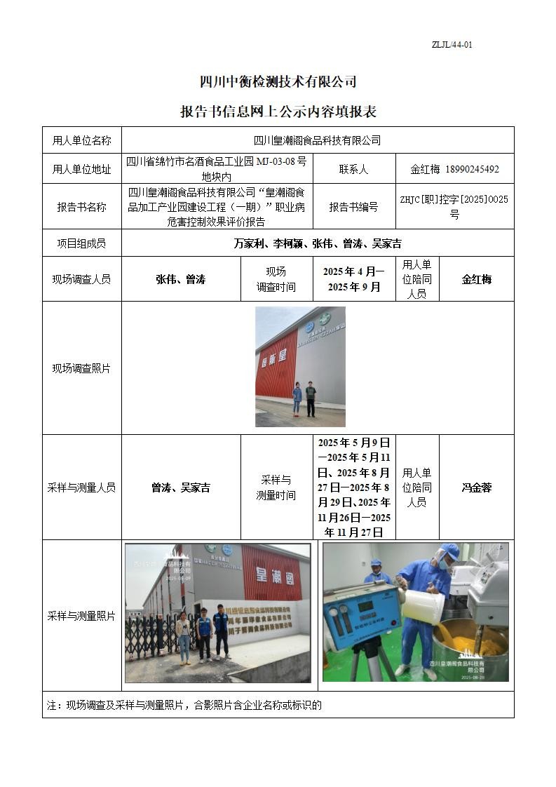 四川皇潮阁食品科技有限公司“皇潮阁食品加工产业园建设工程(一期)”职业病危害控制效果评价