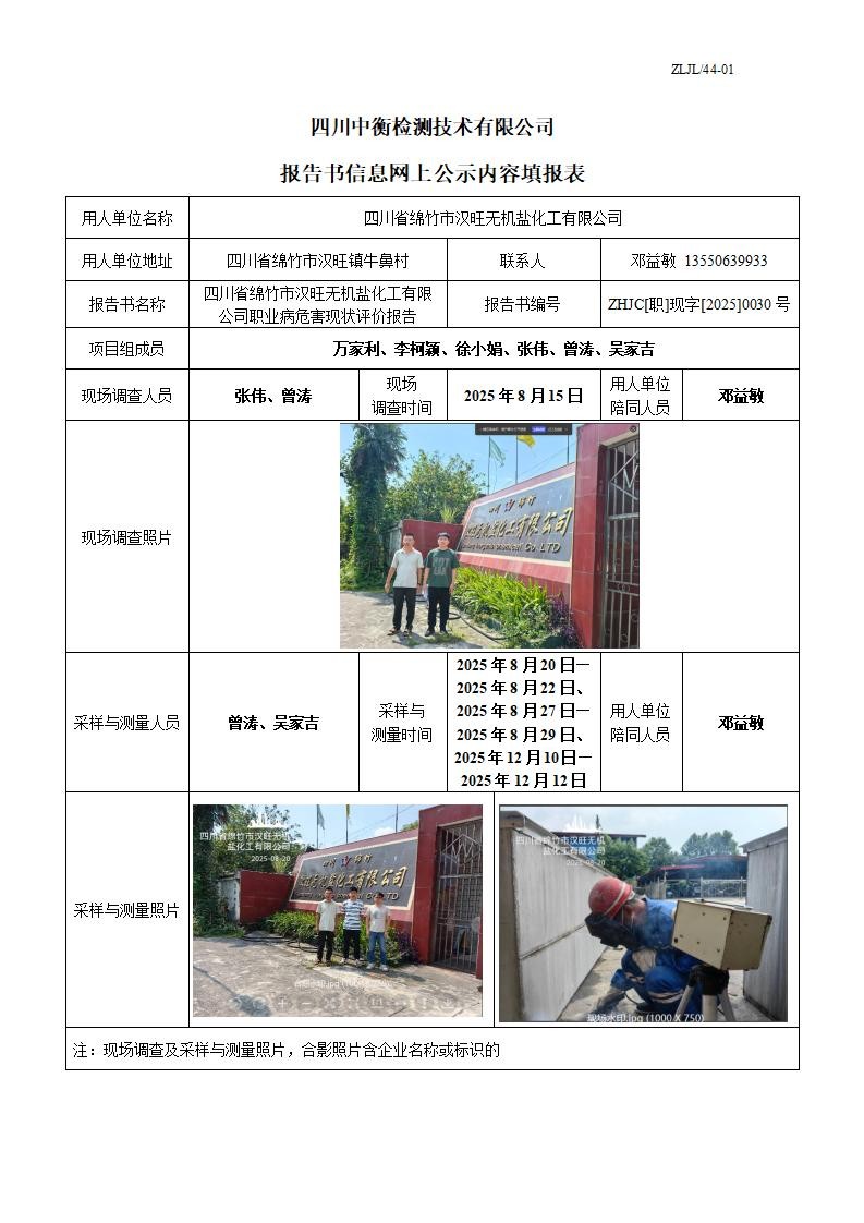 四川省绵竹市汉旺无机盐化工有限公司 职业病危害现状评价